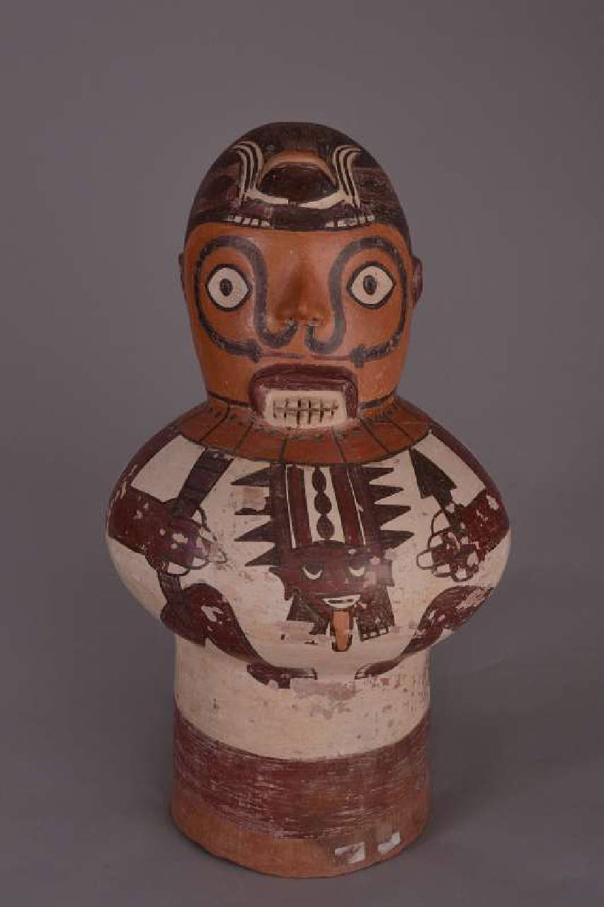 Tamburo aperto, cavo, costituito da una camera cilindrica che si apre in una grande camera globulare centrale alla quale è sovrapposta una piccola camera superiore cefalomorfa con naso, orecchie, labbro superiore, denti incisi e copricapo parzialmente in rilievo. Rappresenta un personaggio seduto che impugna un bastone di comando e la punta di un dardo. Indossa una collana ed un copricapo raffigurante un rospo. Dalla collana fuoriescono due serpenti affrontati.