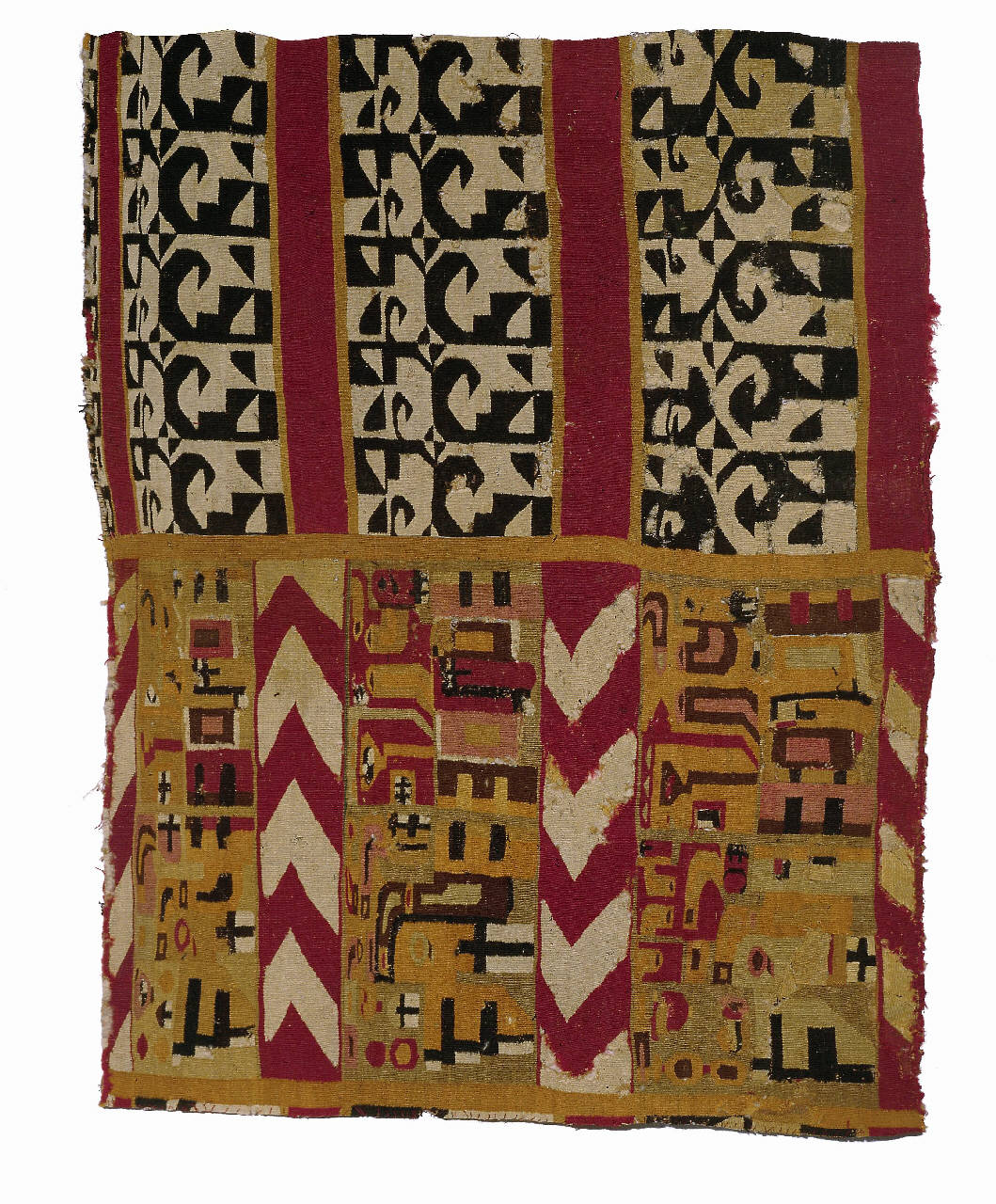 Parte di manto. Il reperto presenta una serie di registri decorativi con i tipici motivi dell'iconografia Huari-Tiahuanaco. Si notano una serie di elementi geometrici quali le V sovrapposte, tracce di greche scalonate, occhi, appendici zoomorfe. Gli orditi sono portati orizzontalmente, i disegni sono schiacciati sulle fasce laterali esterne e ribadiscono la provenienza.