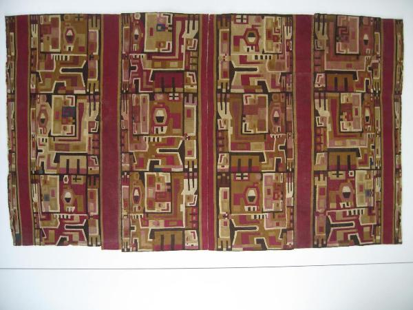 - NOTIZIE STORICO CRITICHE Come si usava nella tradizione tessile huari tiahuanaco, gli orditi sono portati orizzontalmente ed il disegno risulta schiacciato sulle fasce laterali.
