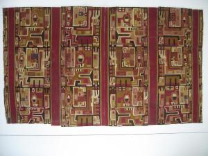 Frammento di camicia diviso in quattro registri decorativi verticali; riporta figure alate con bastoni zoomorfi che affiancano il Dio dei Bastoni nella porta del Sole di Tiahuanaco.