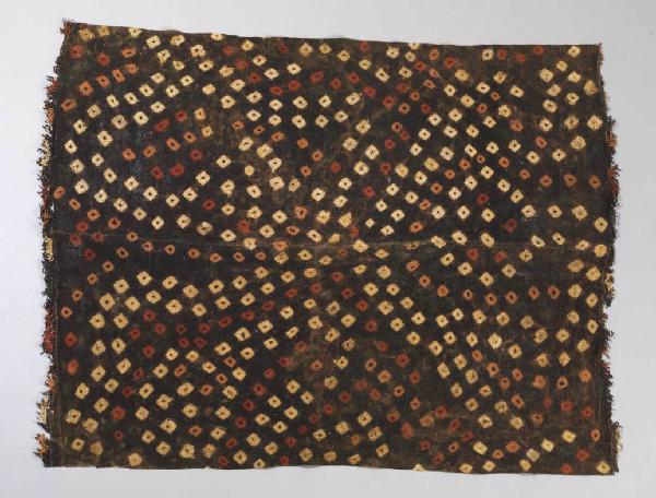 Frammento di manto o di uncu tagliato su di un lato e completo di frange sui lati opposti. La decorazione è a diamante ottenuta con la tecnica tye-dye nei colori del rosso, beige, arancio su fondo marrone scuro.