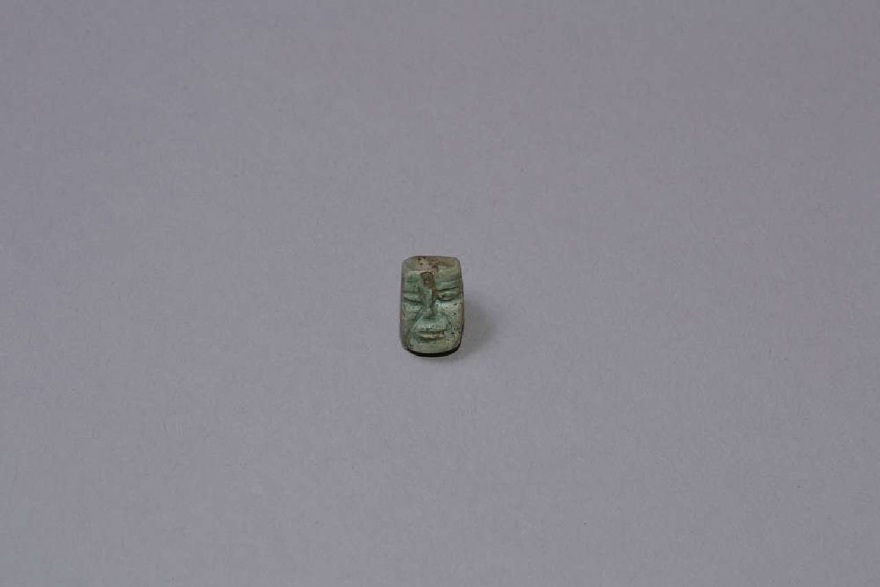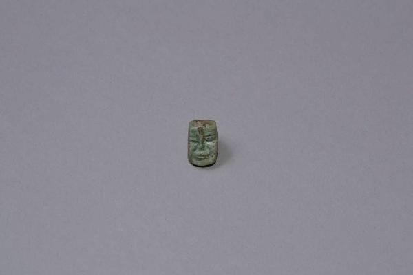 Testina in pietra verde. Raffigura il volto quadrangolare di un individuo dai tratti somatici marcati, realizzato in modo molto rozzo. La bocca è in rilievo e il naso schiacciato, con pieghe evidenti ai lati della bocca. Gli occhi sono ellittici.