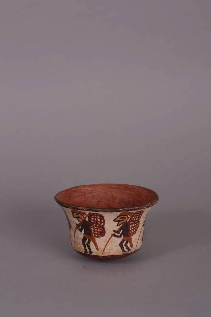 Ciotola aperta a base concava con labbra svasate. Decorata con una teoria di personaggi che portano grandi ceste appese a un bastone.