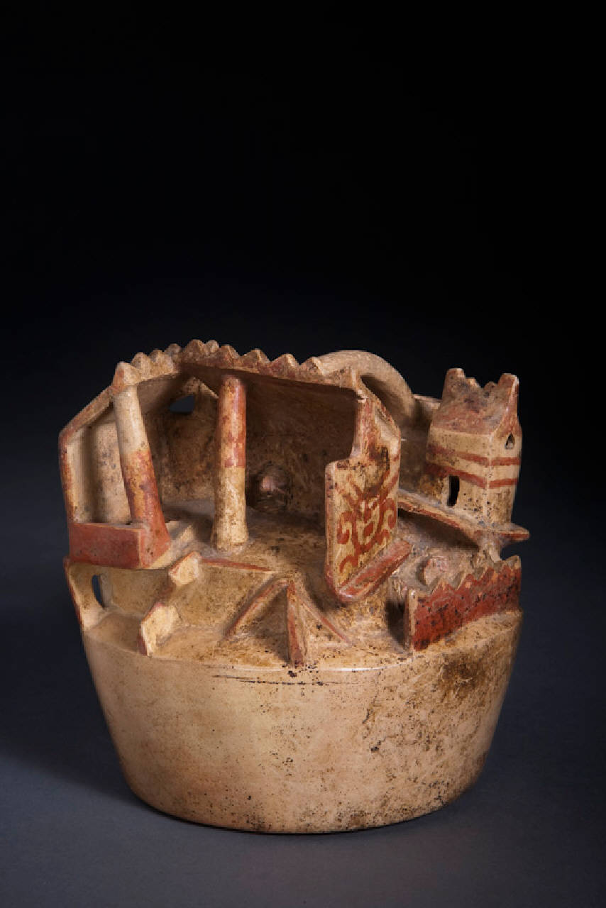 Bottiglia con ansa a staffa. Sulla camera della bottiglia è raffigurato un complesso di edifici, probabilmente rituali. Nel complesso cerimoniale sono rappresentate tre tipologie di edifici diversi: uno a tre pareti solide con tetto a spiovente, uno a tre pareti con entrata frontale e due tetti a spiovente accoppiati, e infine uno chiuso con tetto a due acque. Gli ultimi due sono frequenti nelle fasi IV e V della cronologia moche (VI/VII sec.), mentre la prima tipologia di edificio risale alla fase proto-moche (Wiersema J., The Architectural Vessels of the Moche of Peru (C.E. 200-850): Architecture for the Afterlife, PhD dissertation. University of Maryland Department of Art History and Archaeology, 2010).