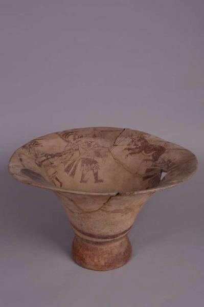 Ciotola con orlo svasato. Il bordo superiore della ciotola presenta il momento finale della caccia rituale ai cervi: tre guerrieri armati di propulsori uccidono due cervi adulti e lasciano fuggire un cervo giovane. Oltre a quanto osservato da Luis Jaime Castillo ("La caccia rituale" in A. Aimi - a cura di - Perù: tremila anni di capolavori, Milano 2003, p. 216) questo rituale era una sorta di rappresentazione in cui le caratteristiche virili e coraggiosi dei guerrieri e dei sovrani, associati ai giaguari, trionfavano sulla viltà e sulla timidezza, associate ai cervi.