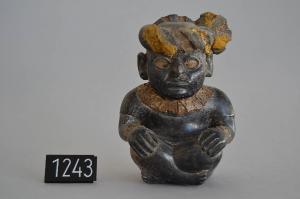 Bottiglia antropomorfa con ansa a staffa. La camera della bottiglia raffigura un personaggio seduto che porta un copricapo a treccia con ornamenti terminanti in ventagli (secondo l'interpretazione di Sergio Purin, si veda bibliografia) o con pendagli (secondo l'interpretazione di Christopher Donnan, idem). Un collare con conterie rettangolari, un uncu, braccialetti. Sul turbante, così come sulla collana e i bracciali era incrostato un materiale terroso giallo non identificato.