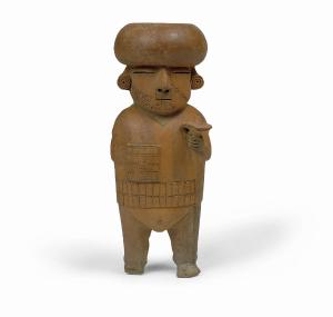 Stauetta in terracotta che rappresenta un guerriero che impugna una mazza e uno scudo decorato da placche fissate mediante due fori superiori. Il guerriero indossa un uncu con una bordura decorata anch'essa a placche, un copricapo a turbante e orecchini a cerchi concentrici. Sul volto compaiono dei tatuaggi che raffigurano motivi scalonati e altre stilizzazioni geometriche.