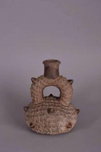 Bottiglia con ansa a staffa. L'ansa e il versatoio sono stati assemblati successivamente. La decorazione è a rilievo, a ricordare la conchiglia Spondylus Princeps. Secondo altre interpretazioni rappresenterebbero il frutto della guanabana.