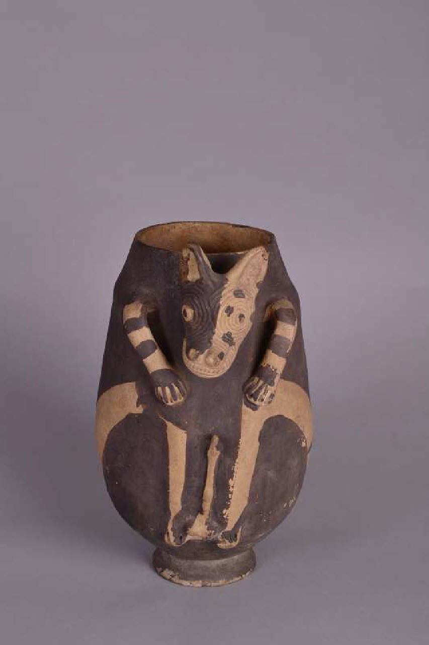 Vaso zoomorfo. Rappresenta un cane senza pelo tipico della zona andina. L'animale è raffigurato a tutto tondo (la testa e parte delle zampe anteriori) in altorilievo (parte delle zampe anteriori) con leggeri rilievi (vertebre, costole) e a disegno (zampe posteriori).