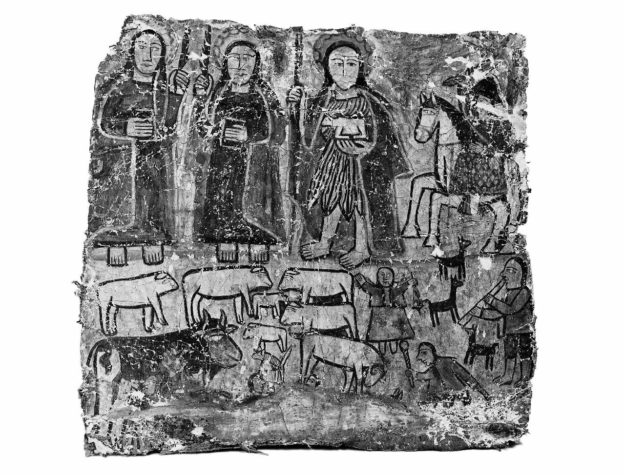 Nel frammento è raffigurata una scena di vita pastorale e santi protettori. Nella parte bassa alcune donne conducono degli animali al pascolo, un personaggio suona uno strumento a fiato (nella parte destra del dipinto) e ha accanto alcuni animali non identificati (cani, lama?). Nella parte alta del dipinto si stagliano, a grande formato, i santi protettori (da sinistra a destra): due santi forse martiri (per la presenza della palma che stringono nella mano) o forse scrittori (invece della palma potrebbe trattarsi della piuma), con un libro nell'altra mano; san Giovanni con un agnello in braccio; Santiago Illapa a cavallo.