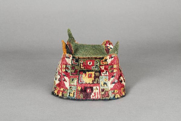 Berretto a quattro punte. Il berretto è formato da due pezze: una costituisce la sommità con le quattro punte, l'altra tutto il laterale. I decori raffigurano teste di felini e/o di lama tipiche dell'iconografia Huari-Tiahuanaco e altri motivi di difficile interpretazione. Questa tipologia di manufatti era indossata dalle alte elite Huari.