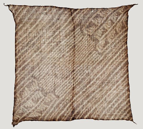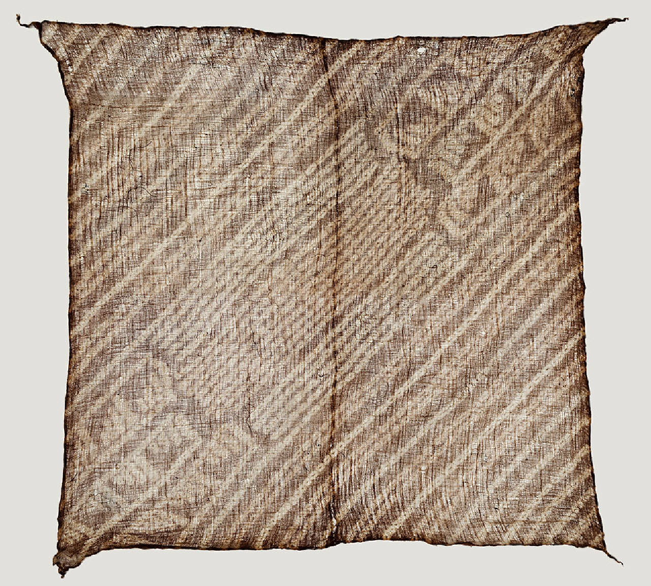 Velo femminile per il capo o pannello in garza di cotone marrone chiaro tinto con la tecnica tie-dye al fine di ottenere fini disegni di tipo geometrico in diagonale. Il tessuto è composto da due pezze cucite in senso verticale.