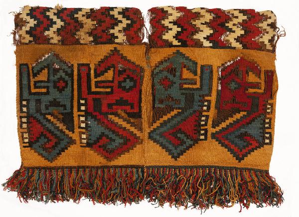 Tunica decorata con quattro elementi zoomorfi fortemente stlilizzati e geometrizzati che tuttavia lasciano intravedere una coda, sei zampe e un becco (?) - bocca spalancato. Superiormente corrono motivi a V sovrapposte e scalonate, inferiormente una frangia lavorata a parte e cucita. L'indumento è composto da due pezze cucite. Tutti gli elementi sono perfettamente conservati. I fili della trama sono mancanti in alcuni punti e lasciano appositamente intravvedere l'ordito per creare un effetto decorativo.