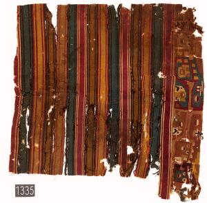 Frammento di tunica, forse cdon maniche, con bande policroime orizzantali e banda laterale con figure aviformi. di seguito la decsrizione di S. Bergh (Cleveland Museum of Art)\nFragment with vertical stripes and fanged profile creatures.\nSelvedges: A selvedge is present on the edge bordering the column with profile creatures; this edge would have been positioned at one side of the tunic, with the figured column and stripes oriented vertically. To create the selvedge, the warp yarns were cut and interlaced back into the edge with a needle. This type of treatment is currently thought to characterize Wari rather than Tiwanaku tapestry production.\nOther: Several series of needle holes appear to span the fragment from side-to-side (parallel to the warp). In one corner of the fragment, the holes are associated with several short, parallel rows of stitching made with dark brown yarn. This feature should be more thoroughly documented under better study conditions.