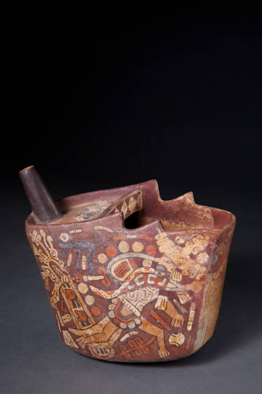 L' oggetto raffigura un edificio. Un lato della bottiglia è diviso in due registri decorativi. Quello inferiore che occupa i 2/3 della superficie, presenta tre personaggi seduti che indossano tuniche con le maniche lunghe e sono avvolti da manti che li coprono quasi totalmente lasciando scoperto solo il lato frontale. Accanto alla testa e alle gambe di ogni personaggio sono collocati due fagotti, che probabilmente contengono delle offerte. Sull'altro lato è raffigurata una divinità.
