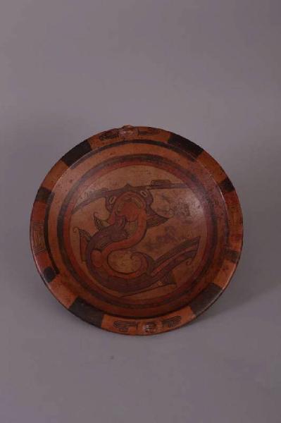 Piatto policromo su piede. Il piatto, il cui fondo è di colore beige omogeneo, è decorato con l'immagine di uno squalo martello dal corpo sinuoso, visto dal basso, dipinto in arancione e rosso e delineato in nero. La parte centrale del piatto è delimitata da una duplice banda rossa e nera. Il bordo è suddiviso in pannelli da rettangoli di colore nero che delimitano due spazi arancioni all'interno dei quali si osservano motivi geometrici quadrangolari costituiti da molteplici linee nere. Agli estremi opposti, due piccole prese in rilievo costituiscono le teste di zoomorfi con tratti del volto in nero e i cui arti sono dipinti in nero ai lati della testa.