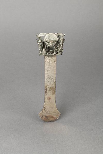 Coltello o tumi. Il manico del tumi, che presenta una forma piuttosto insolita, è decorato superiormente con un personaggio antropo-zoomorfo (rana) e altri elementi tra cui un personaggio con un vaso, una zucca, un flauto di pan e un cestino (?) di vimini.