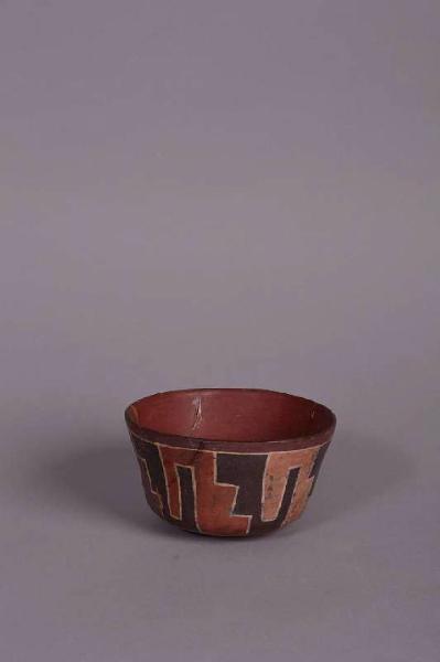 Ciotola aperta a base concava. Decorata a motivo scalonato e interlocking.