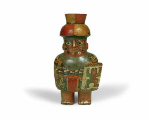 Vaso antropomorfo. Il vaso raffigura un guerriero con pitture facciali, un copricapo semisferico e un elaborato uncu. Porta nella mano sinistra uno scudo decorato con una figura con le braccia alzate, vd inv. PAM 001238.