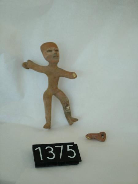 Figurina fittile antropomorfa raffigurante un uomo nudo in posa dinamica, con un braccio in avanti e uno indietro. Il corpo è modellato con rotoli di argilla, mentre il volto è realizzato a stampo. La posizione dell'individuo suggerisce che possa trattarsi di un guerriero, ma la carenza di vesti e altri attributi rende impossibile definirlo con certezza. Impasto senape. Cottura ossidante.