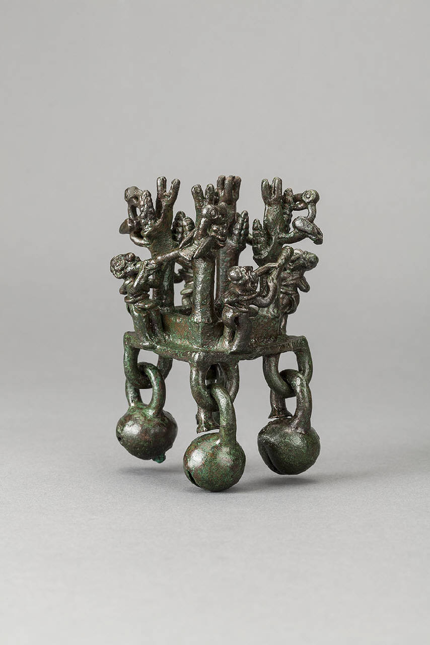 Sommità di bastone di comando. Il reperto presenta una scena di caccia tramite cerbottane a uccelli che beccano dei frutti, probabilmente i fiori di alcuni cactus (le foglie dell'albero hanno il caratteristico profilo a pala).