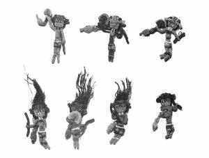 Tredici figurine in fibra di camelidi che rappresentano guerrieri che impugnano bastoni e grandi tumi.