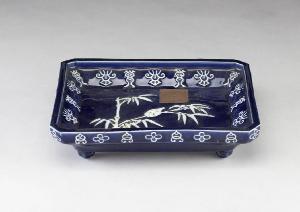 Basso vaso da fiori in ceramica lavorata a rilievo e dipinta a smalto blu. A sezione rettangolare, posa su quattro piedini. Al centro del fondo è una composizione con fusti di bambù (take) e un uccellino. All'interno e all'esterno della parete motivi geometrici di vario genere.