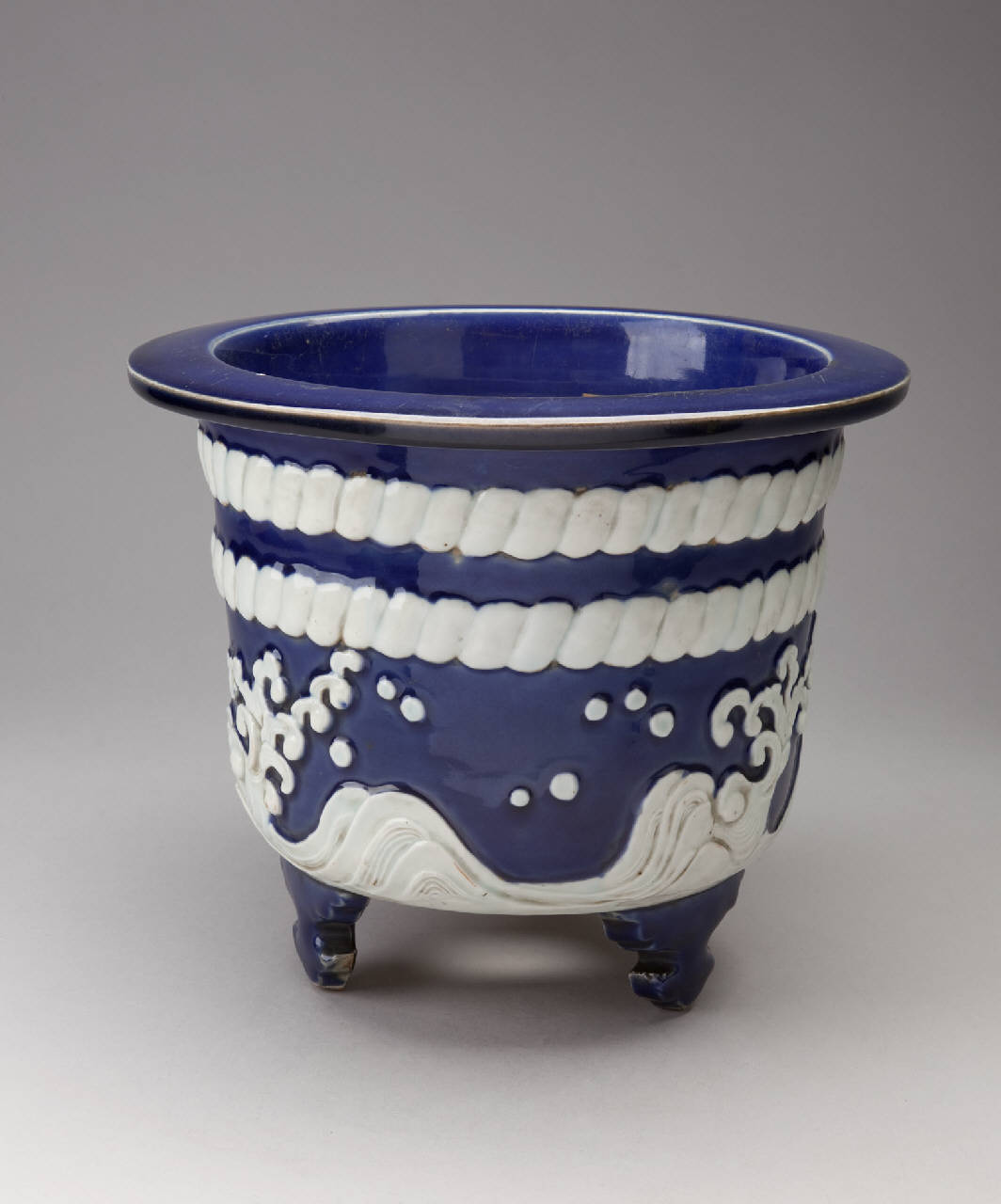 Vaso da giardino (yoki) in porcellana lavorata a rilievo e dipinta a smalto blu. Ha corpo a sezione circolare, posa su tre piedini e ha larga tesa piatta. La decorazione sull'esterno del corpo, realizzata a smalto bianco in rilievo su fondo blu, mostra in alto due corde che corrono parallele lungo tutta la circonferenza del vaso, e in alto da onde marine.