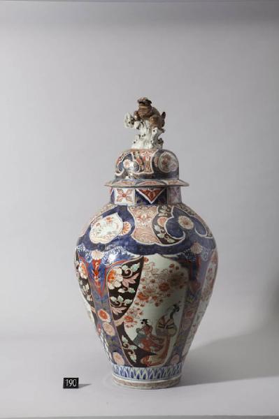 Vaso con coperchio in porcellana dipinta a smalti policromi e arricchita da tocchi d'oro. A sezione circolare, ha massimo diametro verso la base, collo cilindrico e coperchio emisferico con tesa inclinata verso il basso. La decorazione mostra figure femminili, motivi floreali e geometrici; il coperchio è sormontato da presa a forma di "leone cinese" (karashishi).