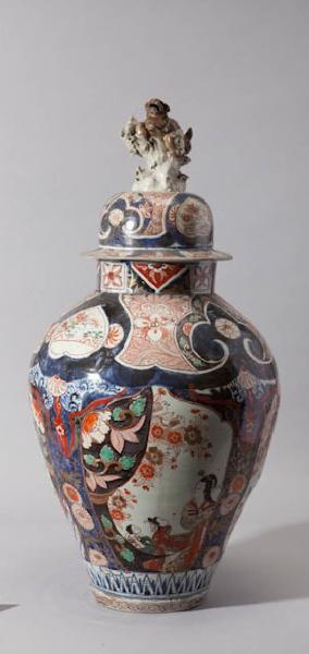 Vaso con coperchio in porcellana dipinta a smalti policromi e arricchita da tocchi d'oro. A sezione circolare, ha massimo diametro verso la base, collo cilindrico e coperchio emisferico con tesa inclinata verso il basso. La decorazione mostra figure femminili, motivi floreali e geometrici; il coperchio è sormontato da presa a forma di "leone cinese" (karashishi).