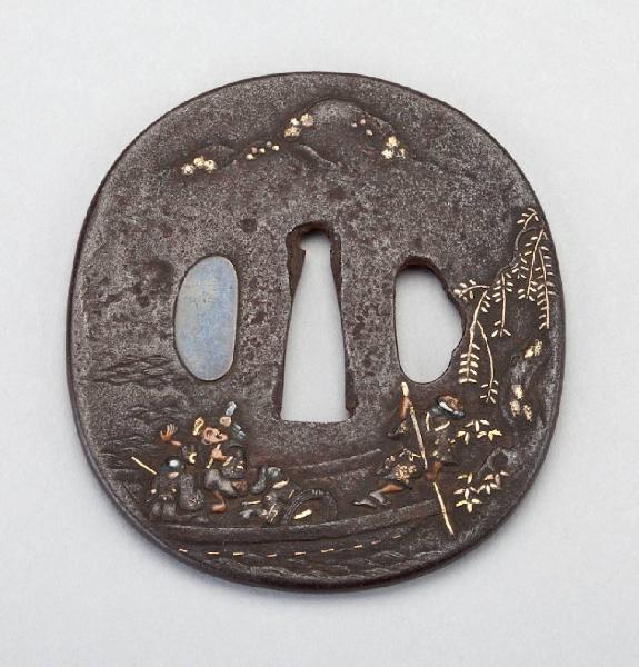 Elsa (tsuba) in ferro con superficie leggermente granulosa (ishimeji), lavorazione ad alto rilievo (takabori) con ageminatura in oro, argento e rame (iroezogan). Il foro per il coltellino (kogatana) è ostruito da piastrina in lega metallica (shakudo). Scena di paesaggio montano con barca con quattro figure e albero.
