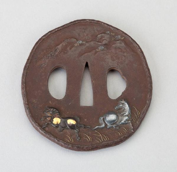 Elsa (tsuba) in ferro di forma all'incirca circolare, con bordo irregolare martellato. Superficie leggermente granulosa (ishimeji), lavorazione ad alto rilievo (takabori) e basso rilievo (nikubori), dettagli in agemina ad alto rilievo (iroe takazogan) di oro, argento e lega metallica (shakudo). Il decoro consiste in una scena di paesaggio con due cavalli in corsa.