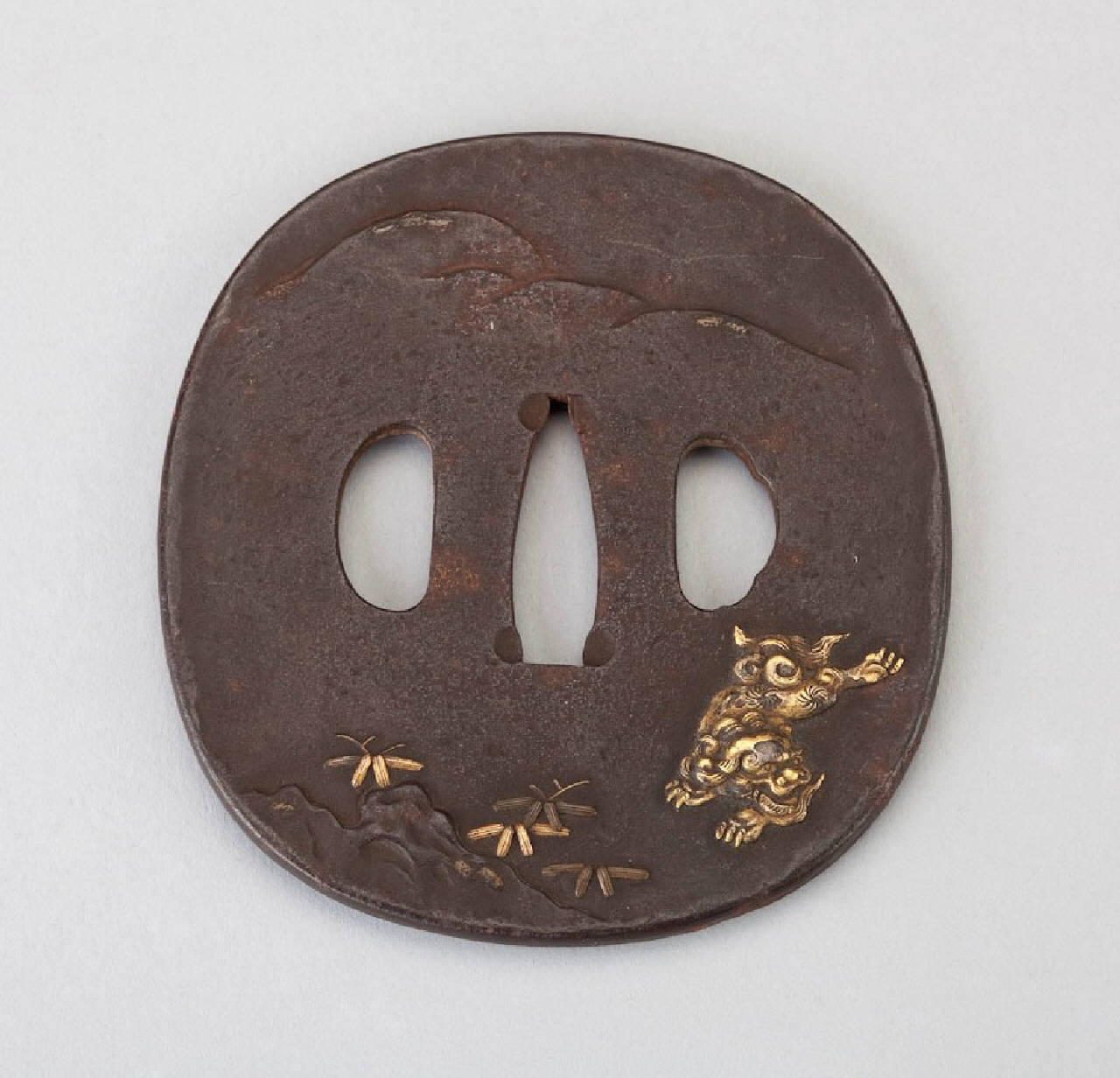 Elsa (tsuba) in ferro di forma all'incirca circolare. Superficie leggermente granulosa (ishimeji), lavorazione ad alto rilievo (takabori) e basso rilievo (nikubori), dettagli in agemina ad alto rilievo (iroe takazogan) di oro. Il decoro consiste in una scena di paesaggio con leone cinese (karashishi) e bambù (take).