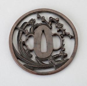 Elsa (tsuba) in ferro di forma all'incirca circolare. Lavorata a traforo (jisukashi), mostra una decorazione in basso rilievo (nikubori) con ramo di pruno (ume) e fiori di genziana.