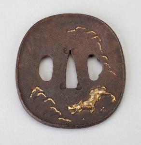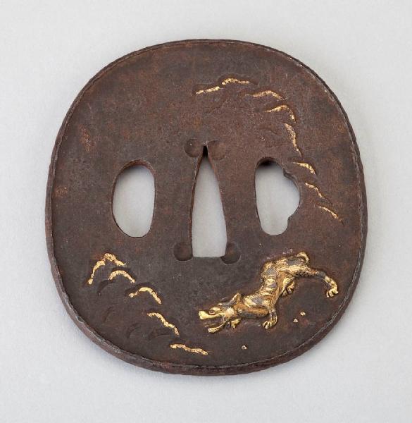 Elsa (tsuba) in ferro di forma all'incirca circolare. Superficie leggermente granulosa (ishimeji), lavorata ad agemina d'oro (nunomezogan) in alto rilievo (takabori) e basso rilievo (nikubori). Decorazione con paesaggio con cane.