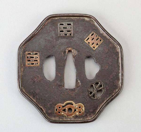 Elsa (tsuba) in ferro di forma ottagonale. Superficie leggermente granulosa (ishimeji) con decoro di motivi geometrici intarsiati in ottone. Bordo evidenziato in lega shakudo.