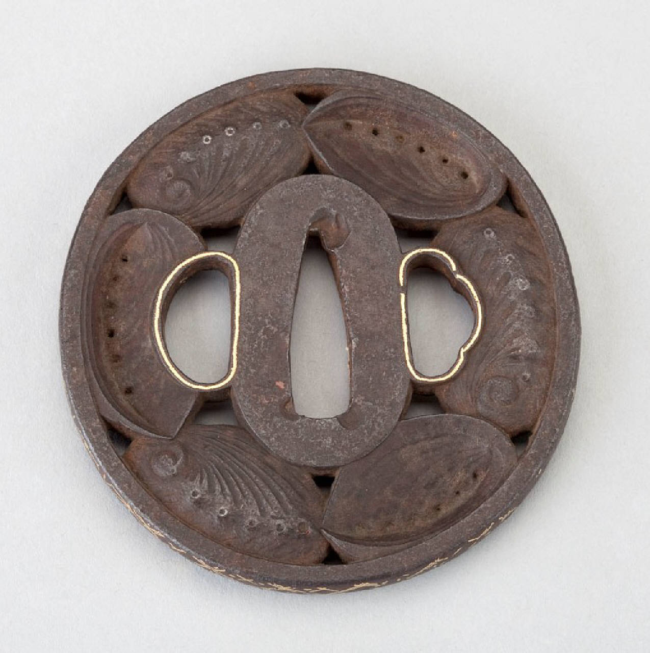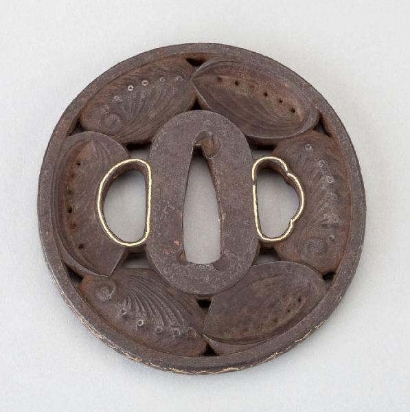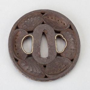 Elsa (tsuba) in ferro di forma all'incirca circolare (marugata). Superficie lavorata a traforo (ji-sukashi) con cinque conchiglie a tutto tondo (marubori). Bordo con disegni ornamentali in agemina d'oro (kinzogan). Orli dei due fori profilati in oro.