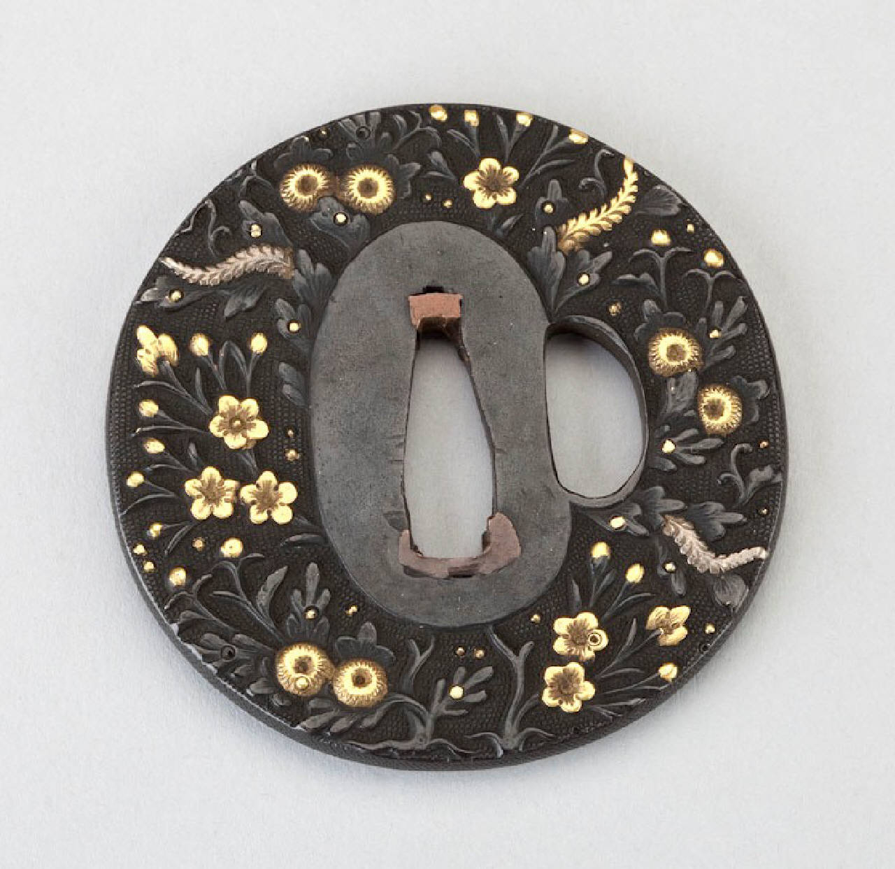 Elsa (tsuba) in lega metallica shakudo di forma all'incirca circolare (marugata). Superficie lavorata a bulino con puntinatura regolare (nanako), alto rilievo (takabori) con dettagli in agemina d'oro (zogan). Decoro di fiori sparsi.