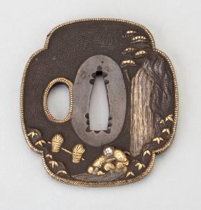 Elsa (tsuba) in lega metallica shakudo di forma quadrilobata (mokkogata). Superficie lavorata a bulino con puntinatura regolare (nanako) decorata con una cascata tra rocce ed alberi eseguiti in alto rilievo (takabori) e una figura di uomo che, posati due cesti di erbe, raccoglie acqua in una zucca, il tutto eseguito in agemina ad alto rilievo in argento, oro e ottone (iroe takazogan). La scena prosegue sul retro con rocce, fiume e alberi. I due fori sono profilati in metallo dorato.