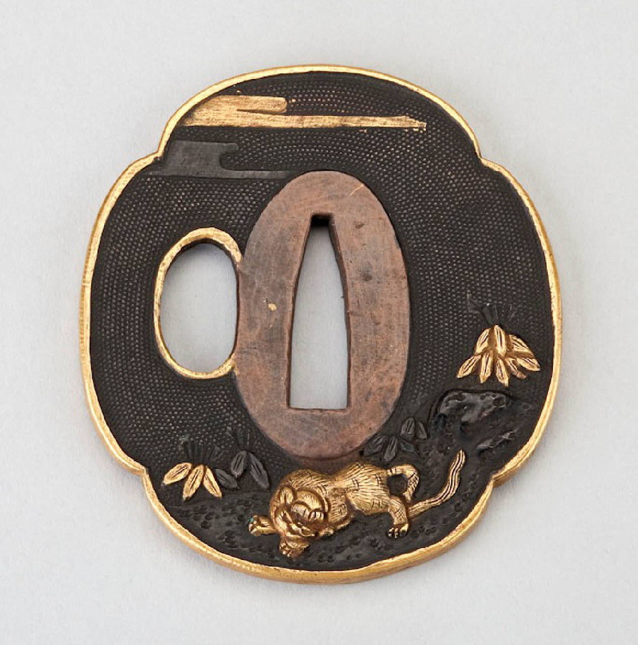 Elsa (tsuba) in lega metallica shakudo di forma quadrilobata (mokkogata). Superficie lavorata a bulino con puntinatura regolare (nanako) decorata con tigre, nuvole e foglie in alto rilievo di metallo dorato (takazogan). Paesaggio eseguito ad alto rilievo (takabori). I due fori sono profilati in metallo dorato.