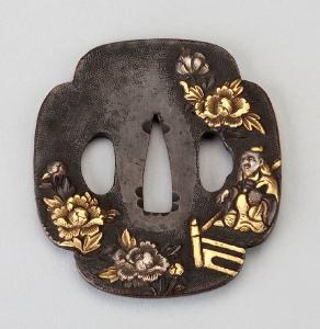 Elsa (tsuba) in lega metallica shakudo a patina nera opaca di forma quadrilobata (mokkogata). Superficie lavorata a bulino con puntinatura regolare (nanako) decorata con saggio cinese seduto su veranda e grandi fiori di peonia eseguiti in agemina ad alto rilievo d'oro, argento e rame (iroe takazogan). Peonie anche sul retro.