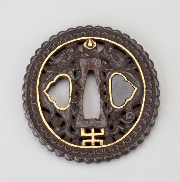 Elsa (tsuba) in ferro di forma all'incirca circolare (mokkogata) con orlo dentellato. Superficie traforata (ji-sukashi) con decoro di due draghi (ryu) contrapposti eseguiti a tutto tondo (marubori) con aggiunte di agemina d'oro (nunome zogan). I due fori hanno profilatura in oro. Il foro per lo spillone (kogai) è ostruito da piastrina in shakudo.
