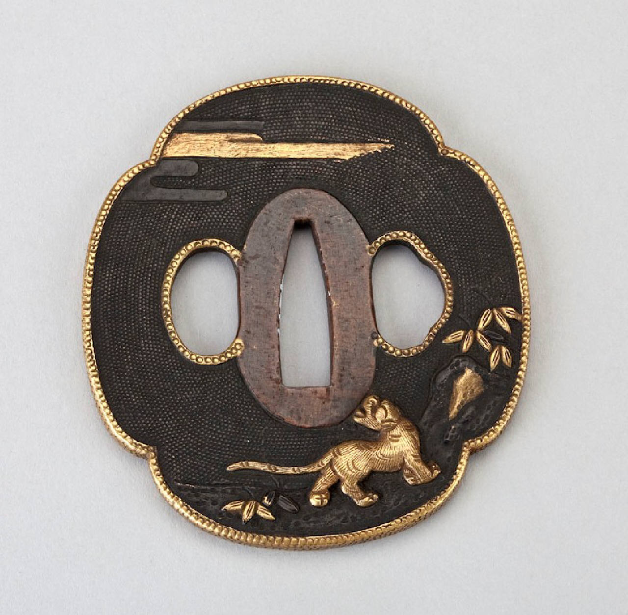 Elsa (tsuba) in lega metallica shakudo di forma quadrilobata (mokko gata). Superficie lavorata a bulino con puntinatura regolare (nanako), decorata con tigre (tora) e bambù (take) in agemina d'oro ad alto rilievo (takazogan), dettagli e paesaggio in alto rilievo (takabori).