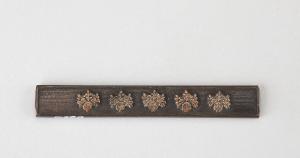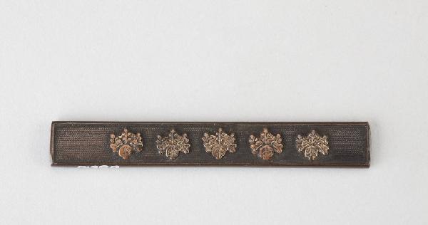 Impugnatura (kozuka) di coltellino (kogatana) in lega metallica shakudo. Superficie lavorata a bulino con puntinatura regolare (nanako), decorata con cinque foglie di paulonia (kiri) in agemina d'oro ad alto rilievo (takazogan).
