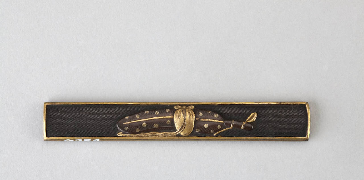 Impugnatura (kozuka) di coltellino (kogatana) in lega metallica shakudo. Superficie lavorata a bulino con puntinatura regolare (nanako), decorata con penna (haboki) e borsa per il the (cha ire fukuro) in altorilievo (takabori) con dettagli in oro (takazogan).