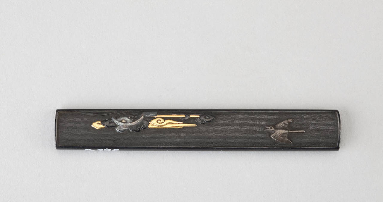 Impugnatura (kozuka) di coltellino (kogatana) in lega metallica shakudo. Superficie lavorata a bulino con puntinatura regolare (nanako), decorata con cuculo (hototogisu) in volo tra nubi e luna in agemina d'oro e argento ad alto rilievo (iroe-takazogan).