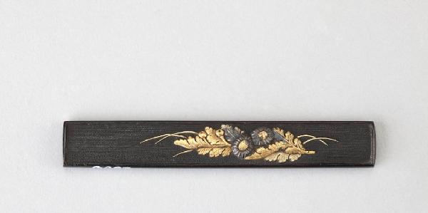 Impugnatura (kozuka) di coltellino (kogatana) in lega metallica shakudo. Superficie lavorata a bulino con puntinatura regolare (nanako), decorata con tralcio di crisantemo (kiku) in agemina d'oro e argento ad alto rilievo (iroe-takazogan).