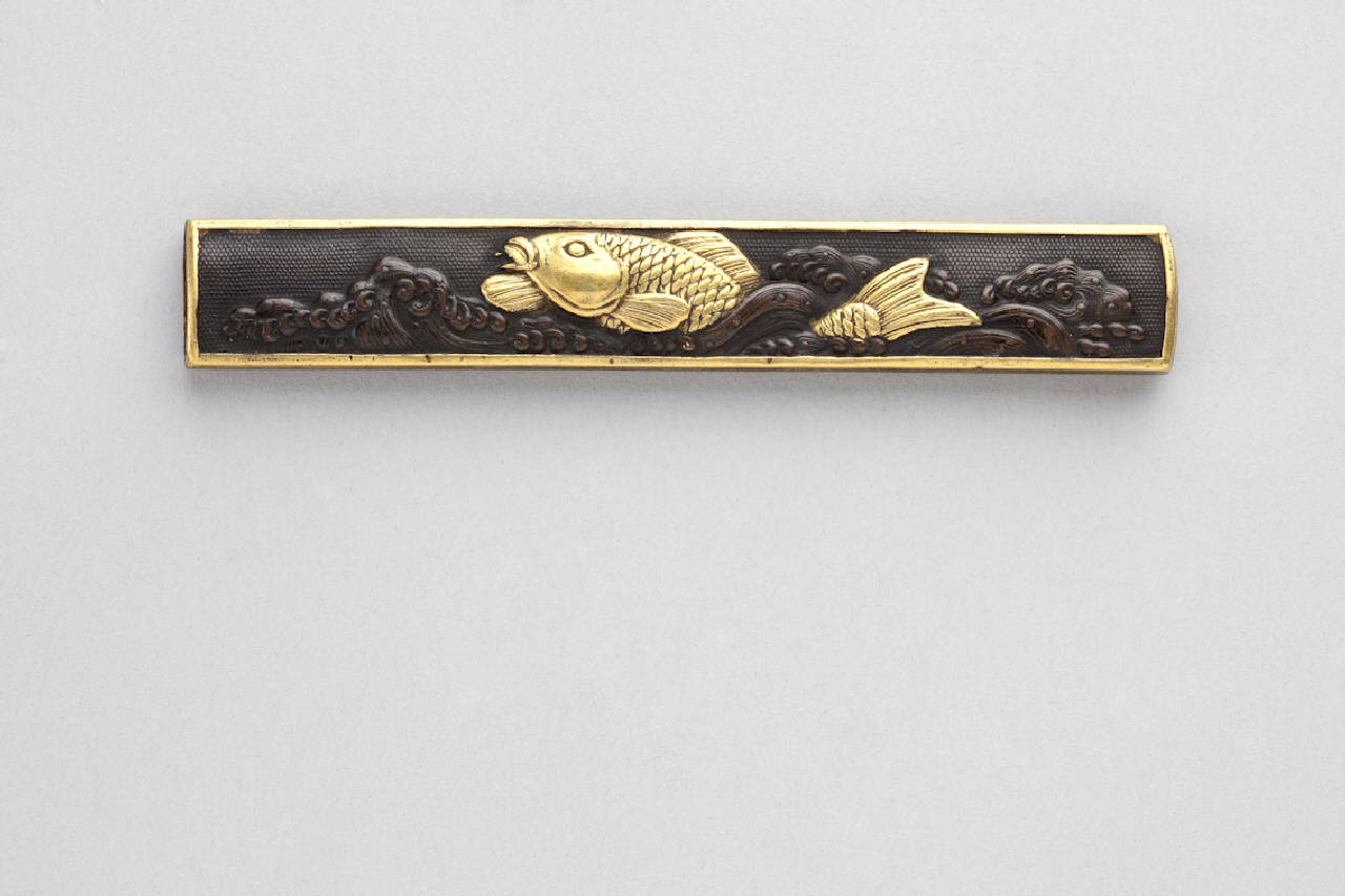 Impugnatura (kozuka) di coltellino (kogatana) in lega metallica shakudo. Superficie lavorata a bulino con puntinatura regolare (nanako), decorata con carpa tra le onde in agemina d'oro e argento ad alto rilievo (iroe-takazogan).