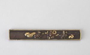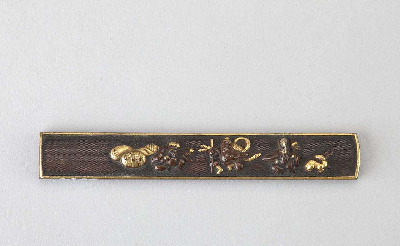 Impugnatura (kozuka) di coltellino (kogatana) in lega metallica shakudo. Superficie lavorata a bulino con puntinatura regolare (nanako), decorata con le figure di Fukurokuju, Bishamonten e Daikoku in agemina d'oro ad alto rilievo (takazogan).