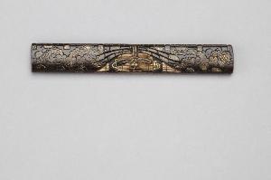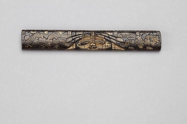 Impugnatura (kozuka) di coltellino (kogatana) in lega metallica. Superficie decorata con drappo ornato di motivi vegetali con fiocco in bassorilievo (nikubori) e agemina d'oro (iroezogan).